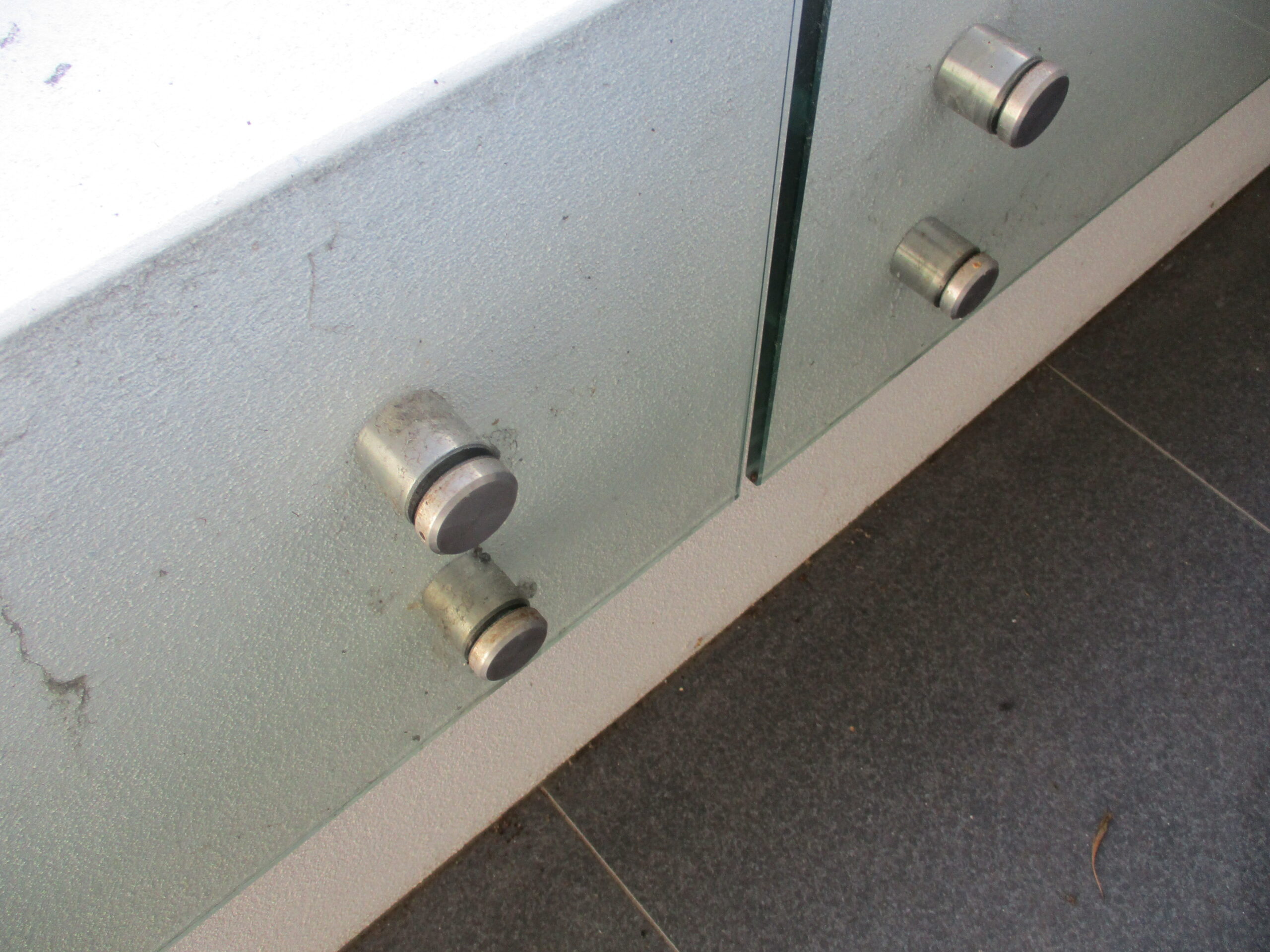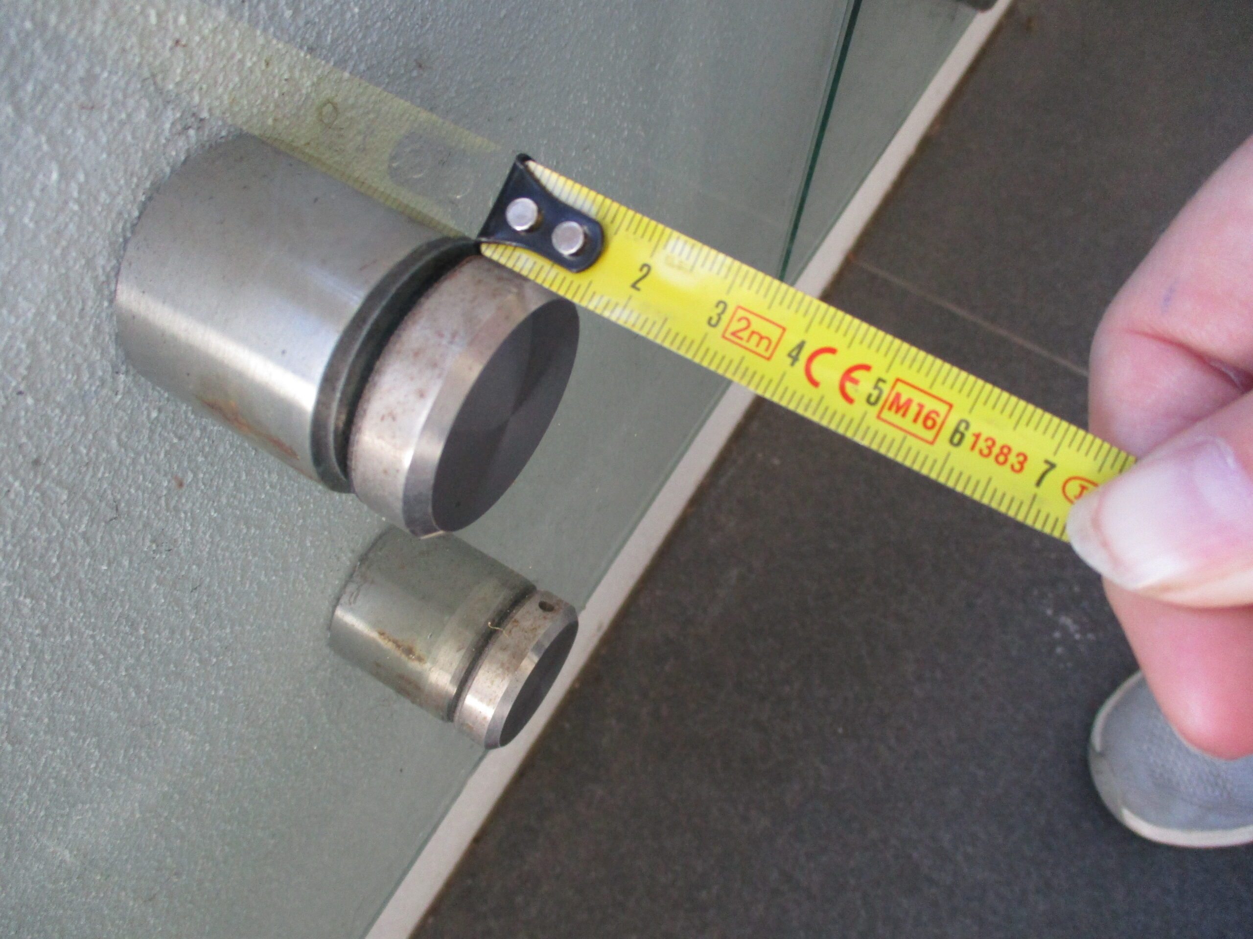 One common issue, is the standoffs (I think it should be called the stand-ons). The pictures below show a number of different standoffs we have seen used on glazed balustrades. The first standoff (main image) shown above complies. The below examples would all fail to comply. The standoff sits out approximately 12mm and the chamfered edge is cut at an angle of approximately 45 degrees in lieu of the 60-degree angle required in the pool barrier standard.